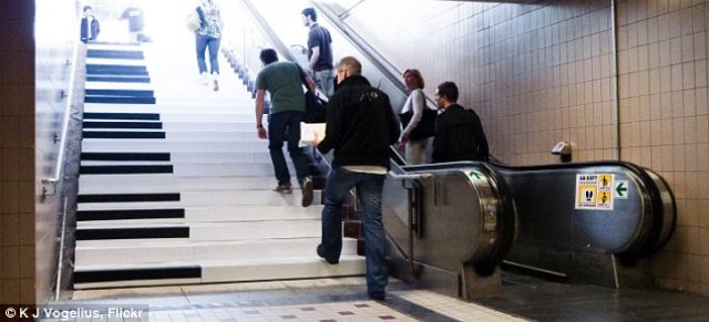 Les escaliers peuvent également être habillés pour inciter à les utiliser. En 2009, à Stockolhm, les marches d’un escalier deviennent les touches d’un piano, émettant un son. De façon ludique, les usagers se sont ainsi plus servi des escaliers que de l’escalator.