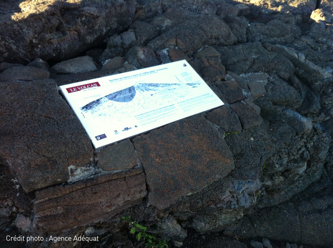 Ce sont des panneaux à but pédagogique donnant des informations historiques et naturelles. Cette signalétique est quand à elle en lave émaillée, directement intégrée dans les coulées de lave séchée.