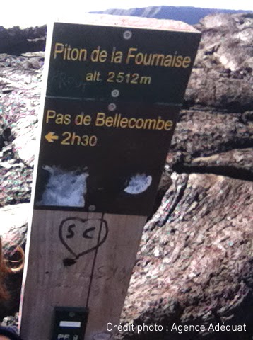 Le lieu où l’on se trouve est indiqué en jaune sur fond vert. Les informations directionnelles sont indiquées en jaune sur fond marron. Avec les points d’intérêts est systématiquement donné le temps de marche restant à parcourir. Une information fortement appréciée des randonneurs.